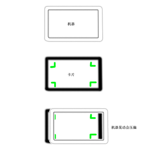 有很多客户设计的会员卡非常华丽,非常精致和漂亮,殊不知有些地方是不能乱设计的,比如说这个图上所示,第一张图上面是机器设备,第二张是即将要压的会员卡,第二张绿色的部分就是客户所设计的部分,绿色的可以是任意形状和图案,大家有没有发现一个问题,就是第二张图的会员卡上面绿色部分太靠边了,最终会导致什么样的情况呢。大家来看第三张图,当机器往卡上面一下的时候,就会超过会员卡的边,这样导致机器把卡给压坏了。